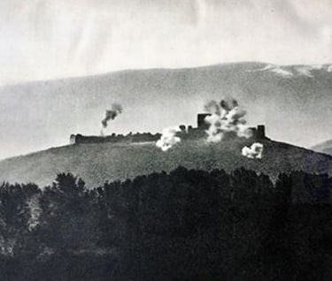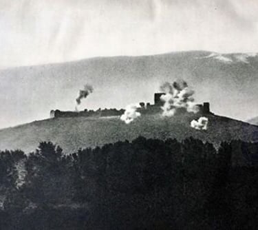 A historical photo showing Platamon Castle under German artillery fire on April 15, 1941.