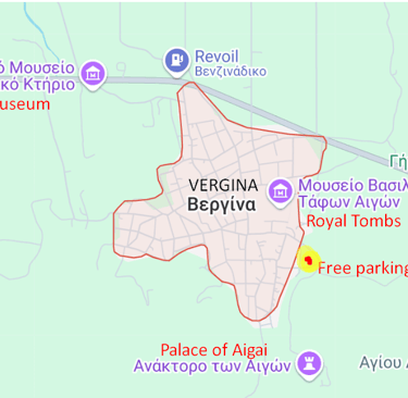 Vergina is approximately 79 kilometers (49 miles) from Thessaloniki, making for a 52-minute drive by car, depending on traffic.